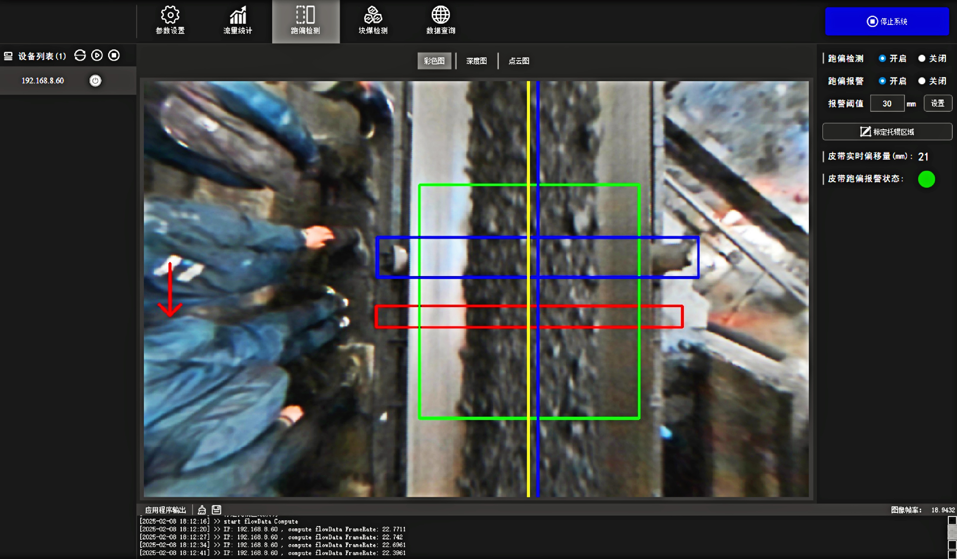 料型料流监测一体机系统 凯发®智能料型料流监测系统由智能煤流监测一体机搭配监测平台构成,实时监测输送带工业散料流量,包含煤矿、砂石骨料、粮食等 首页 产品 3D相机 凯发® 料型料流监测一体机 RBGD智能一体机 凯发® 料型料流监测一体机 系统由智能料流监测一体机搭载监测平台构成,由稳定的底层硬件、嵌入式算法软件和自动化监测管理平台实现服务,实时采集高精度煤流RGBD数据,完成场景的实时三维彩色点云重建,对高速运动的皮带输送机进行精细化管理调控→应用场景: 煤矿检测系统精细化管理 定制解决方案 应用场景 煤流统计支持皮带速度6m/s,环境适应强,部署简单,无需改造现场环境即可安装块煤检测通过三维点云数据分析,能够对块煤的尺寸进行精确测量,准确计算出块煤的长、宽、高等尺寸数据输送带自动测速自动测量高速运动中的输送带速度,确保及时发现异常波动输送带跑偏检测通过获取的输送带三维尺寸位移信息,对皮带左右边缘位置与阈值比较并判断是否偏离正常轨道,同时计算跑偏幅度和方向煤流高度检测对煤流高度精准检测,能够有效管理煤流的分布、运输量、堆积情况 产品特点 测量误差<5%在高速动态检测上,测量精度可达毫米级,测量结果与实际煤量误差小于5%工业级硬件设计采用IP65防护等级和工业级防尘防水,可在高粉尘、大温差的情况下稳定运行室内暗光环境适用在室内、地下、夜晚能稳定测量,无需补光部署简单,安装便捷,支持二次开发出厂相机内参标定,可快速部署集成,无需改变现场环境即可安装,实施速度快,调试简单,系统易于维护接口丰富,数据直传丰富的系统对接接口,可直接对接PLC、变频器、服务器,快速完成精细化皮带控制大景深、大视野,多范围应用测量皮带宽度达2.4m;煤堆高度达1.5m边缘计算架构,实时测量使用边缘计算架构,将多种智能算法在边缘端实现,保证数据实时传输 性能参数 RGBD智能一体机型号VEA020-800-X180参数技术原理主动式双目基线长度180mm测量范围0.9m~2.5mZ向精度1m:≤1.3mm帧率25fps数据类型深度图、彩色图、红外图、点云图分辨率彩色图像:1280x800/640x400 ; 深度图像:1280x800/640x400像素形式彩色图: 8位三通道图 ;深度图:16位单通道图彩色视场角Horizontal 90°,Vertical 64°深色视场角Horizontal 90°,Vertical 64°RGBD同步对齐支持曝光类型全局曝光曝光控制自动/手动流量统计技术参数推荐安装高度1.2m~1.5m覆盖输送带范围0~3m支持输送带速度0~6m/s,推荐0~4m/s流量统计精度误差<5%物料高度测量支持,精度毫米级自动测速支持,安装位置需要具备照明条件实时流量统计 支持,统计周期支持配置跑偏检测支持,跑偏精度可达毫米级块煤检测 支持,支持块煤参数定义数据存储支持5年以上体积结果化数据存储数据查询支持按小时,天和月等维度查询实时视频支持rtsp协议彩色图像拉流点云数据支持彩色点云拼接数据输出协议支持TCP硬件参数数据传输接口千兆以太网相机供电要求12V~24V DC功耗18w结构尺寸(mm)270mm x 80mm x 44mm重量(g)1200g防护等级IP65温度工作温度:-25 ~50°C ;存储温度:-30 ~80°C湿度20% ~ 85%散热方式被动散热软件支持开发环境Windows/Linux数据协议TCP数据查看流量统计客户端 点云图 资料下载 凯发® 煤流体积测量输送带监测管理平台 产品资料下载 请填写此表格并点击提交后,程序会自动下载文件 *合作意向 请选择 商务合作 媒体合作 投资者合作 *电话 *姓名 公司 行业 职位 邮箱 地址 您的留言 提交并下载资料 您也可以拨打凯发的客服电话:010-81046658 联系凯发